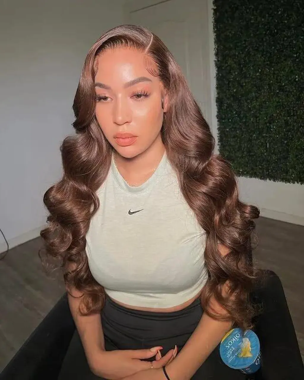 Megalook 13x6 Three-Go™ Schokoladenbraune Klebefreie Perücken mit Körperwelle und Kordelzug 100% Echthaar Perücke