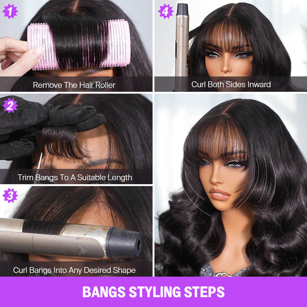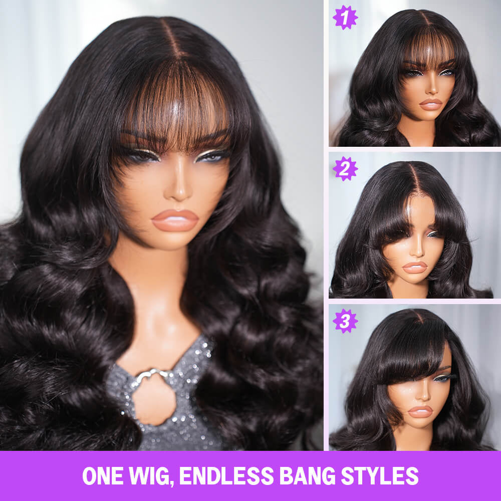 Megalook 5x5 Invisible Knots With Curtain Bang Loose Wave Natural Black Wig Pre-Cut Lace Beginner Friendly