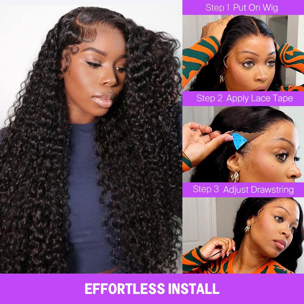 Megalook 13x6 Three-Go™ Glueless Wig Curly Water Wave With Drawstring Natural Black Breathable Cap 100% Human Hair Wig